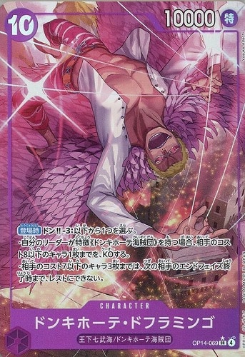 ・自分のリーダーが特徴《ドンキホーテ海賊団》を持つ場合、相手のコスト8以下のキャラ1枚までを、KOする。_x000D_
