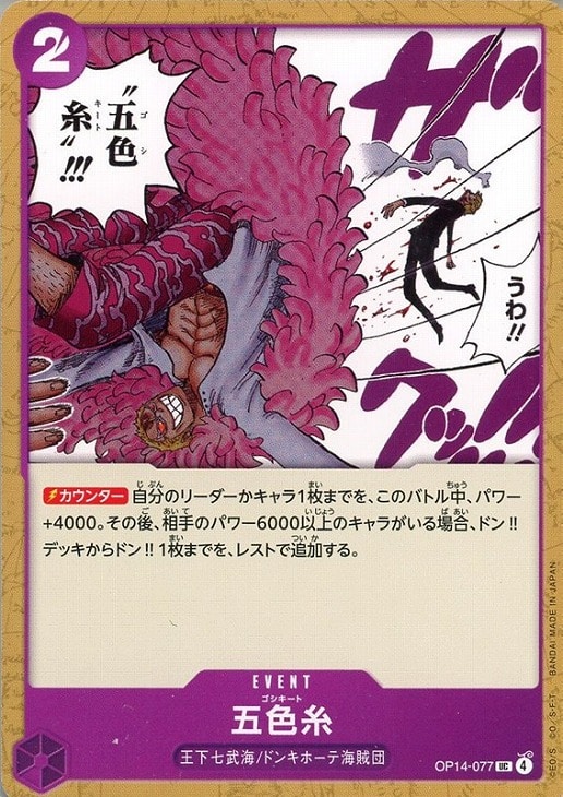 - 【カウンター】自分のリーダーかキャラ1枚までを、このバトル中、パワー+4000。その後、相手のパワー6000以上のキャラがいる場合、ドン!!デッキからドン!!1枚までを、レストで追加する。