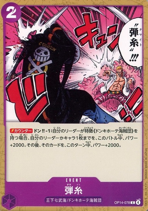 - 【カウンター】ドン!!-1:自分のリーダーが特徴《ドンキホーテ海賊団》を持つ場合、自分のリーダーかキャラ1枚までを、このバトル中、パワー+2000。その後、そのカードを、このターン中、パワー+2000。