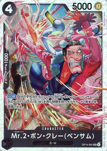 - 【KO時】自分の手札かトラッシュから「Mr.2・ボン・クレー(ベンサム)」以外のコスト5以下の『B・W』を含む特徴を持つキャラカード1枚までを、登場させる。