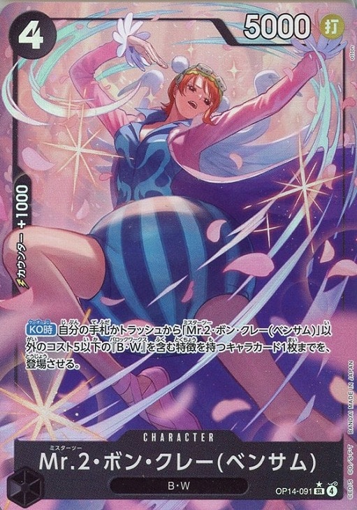 - 【KO時】自分の手札かトラッシュから「Mr.2・ボン・クレー(ベンサム)」以外のコスト5以下の『B・W』を含む特徴を持つキャラカード1枚までを、登場させる。