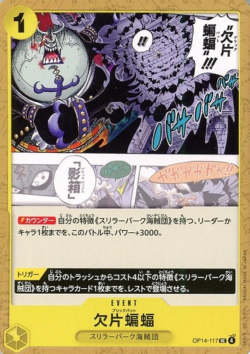 【カウンター】自分の特徴《スリラーバーク海賊団》を持つ、リーダーかキャラ1枚までを、このバトル中、パワー+3000。