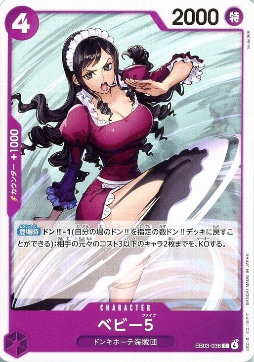 - 【登場時】ドン!!-1(自分の場のドン!!を指定の数ドン!!デッキに戻すことができる):相手の元々のコスト3以下のキャラ2枚までを、KOする。