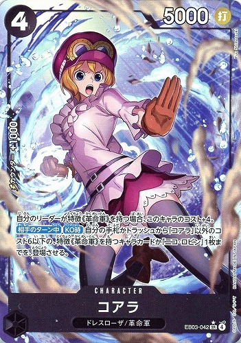 【相手のターン中】【KO時】自分の手札かトラッシュから「コアラ」以外のコスト6以下の、特徴《革命軍》を持つキャラカードか「ニコ・ロビン」1枚までを、登場させる。