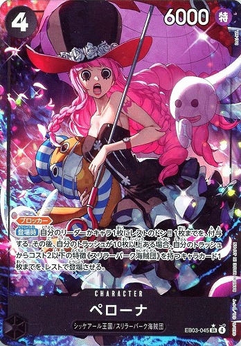 【登場時】自分のリーダーかキャラ1枚にレストのドン!!1枚までを、付与する。その後、自分のトラッシュが10枚以上ある場合、自分のトラッシュからコスト2以下の特徴《スリラーバーク海賊団》を持つキャラカード1枚までを、レストで登場させる。