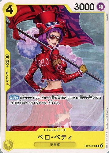 - 【登場時】自分のライフの上から1枚を表向きにできる:相手の元々のコスト3以下のキャラ1枚までを、KOする。