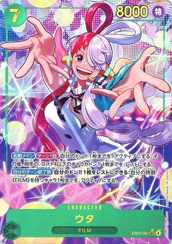 - 【登場時】自分のリーダーが「ウタ」の場合、カード2枚を引く。その後、自分の手札からパワー6000以下の元々の効果のないキャラカード1枚までを、登場させる。