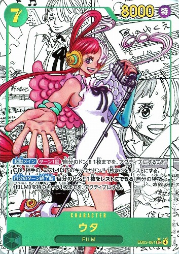 - 【登場時】自分のリーダーが「ウタ」の場合、カード2枚を引く。その後、自分の手札からパワー6000以下の元々の効果のないキャラカード1枚までを、登場させる。
