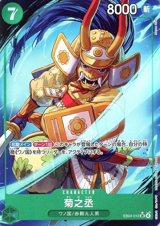 - 【起動メイン】【ターン1回】このキャラが登場したターンの場合、自分の特徴《ワノ国》を持つリーダーを、アクティブにする。