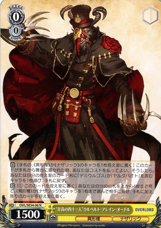 【起】[(1) このカードを控え室に置く] あなたは自分の山札を上から4枚まで見て、《異形種》か《ナザリック》のキャラを1枚まで選んで相手に見せ、手札に加え、残りのカードを控え室に置く。