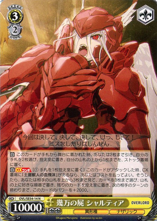 【自】【CXコンボ】[(1) 手札を1枚控え室に置く] このカードがアタックした時、CX置場に「土掘獣人の血飛沫」があるなら、あなたはコストを払ってよい。そうしたら、あなたは相手の山札を上から3枚まで見て、カードを3枚まで選び、山札の上に好きな順番で置き、残りのカードを控え室に置き、次の相手のターンの終わりまで、このカードのパワーを+2000。