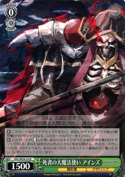 【自】 このカードが【リバース】した時、あなたのキャラすべてが緑か《異形種》か《ナザリック》なら、あなたは自分の山札の上から1枚を公開する。そのカードがレベル2以下のキャラなら、あなたはこのカードをストック置場の下に置いてよい。(公開したカードは元に戻す)