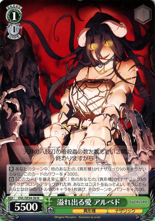 【自】[このカードを控え室に置く] 他のあなたの、《異形種》か《ナザリック》のキャラがフロントアタックされた時、あなたはコストを払ってよい。そうしたら、あなたは自分のバトル中のキャラを1枚選び、そのターン中、パワーを+2500。