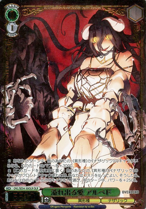 【自】[このカードを控え室に置く] 他のあなたの、《異形種》か《ナザリック》のキャラがフロントアタックされた時、あなたはコストを払ってよい。そうしたら、あなたは自分のバトル中のキャラを1枚選び、そのターン中、パワーを+2500。