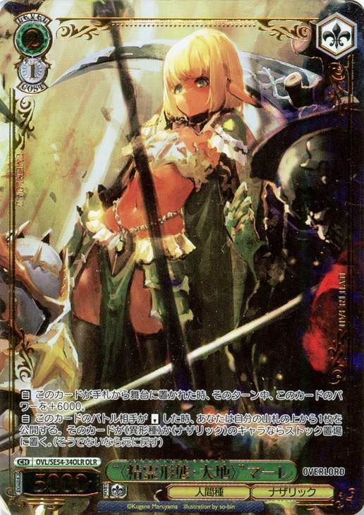【自】 このカードのバトル相手が【リバース】した時、あなたは自分の山札の上から1枚を公開する。そのカードが《異形種》か《ナザリック》のキャラならストック置場に置く。(そうでないなら元に戻す)