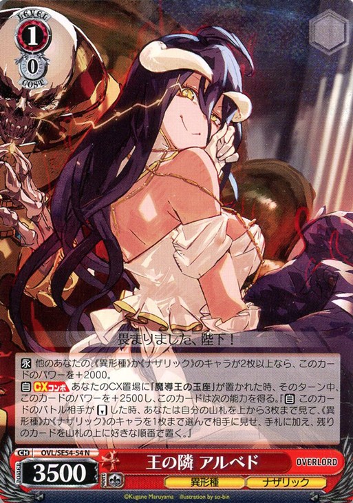 【自】【CXコンボ】 あなたのCX置場に「魔導王の玉座」が置かれた時、そのターン中、このカードのパワーを+2500し、このカードは次の能力を得る。『【自】 このカードのバトル相手が【リバース】した時、あなたは自分の山札を上から3枚まで見て、《異形種》か《ナザリック》のキャラを1枚まで選んで相手に見せ、手札に加え、残りのカードを山札の上に好きな順番で置く。』