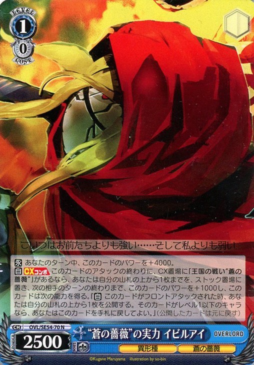 【自】【CXコンボ】 このカードのアタックの終わりに、CX置場に「王国の戦い“蒼の薔薇”」があるなら、あなたは自分の山札の上から1枚までを、ストック置場に置き、次の相手のターンの終わりまで、このカードのパワーを+1000し、このカードは次の能力を得る。『【自】 このカードがフロントアタックされた時、あなたは自分の山札の上から1枚を公開する。そのカードがレベル1以下のキャラなら、あなたはこのカードを手札に戻してよい。』(公開したカードは元に戻す)