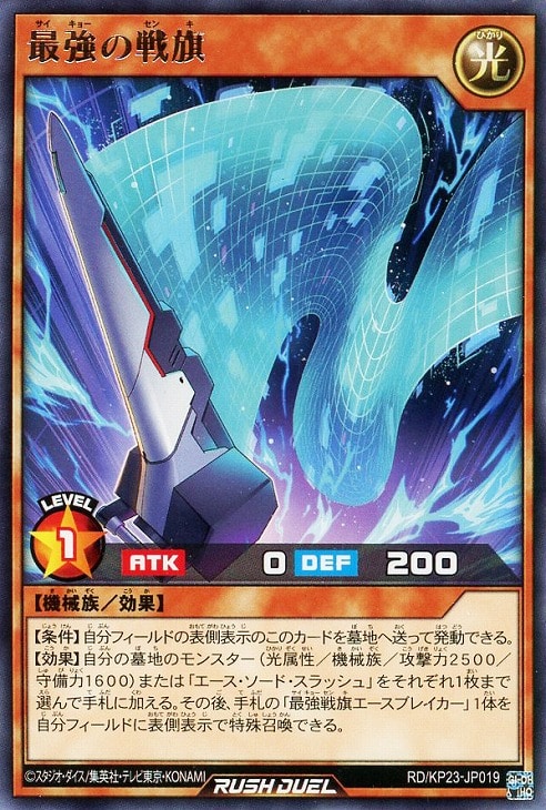 【効果】自分の墓地のモンスター(光属性/機械族/攻撃力2500/守備力1600)または「エース・ソード・スラッシュ」をそれぞれ1枚まで選んで手札に加える。その後、手札の「最強戦旗エースブレイカー」1体を自分フィールドに表側表示で特殊召喚できる。
