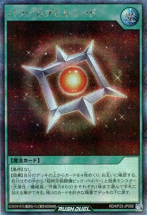 【効果】自分のデッキの上からカードを4枚めくり、お互いに確認する。自分はその中から「超時空戦闘機ビック・バイパー」と効果モンスター(光属性/機械族/守備力800)をそれぞれ1体まで選んで手札に加える事ができる。残りのカードを好きな順番でデッキの下に戻す。