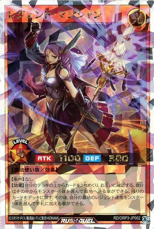 【効果】自分のデッキの上からカードを3枚めくり、お互いに確認する。自分はその中からモンスター1体を選んで墓地へ送る事ができる。残りのカードをデッキに戻す。その後、自分の墓地のレジェンド通常モンスター1体を選んで手札に加える事ができる。