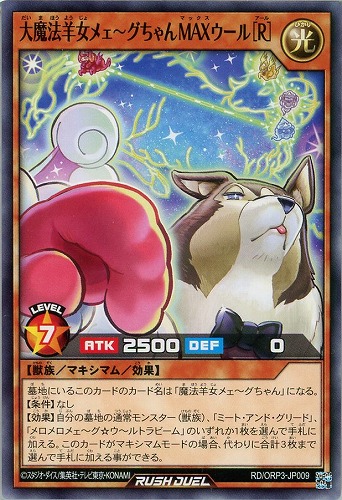 【効果】自分の墓地の通常モンスター(獣族)、「ミート・アンド・グリード」、「メロメロメェ~グ☆ウ~ルトラビーム」のいずれか1枚を選んで手札に加える。このカードがマキシマムモードの場合、代わりに合計3枚まで選んで手札に加える事ができる。