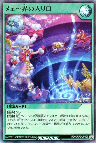【効果】自分フィールドの表側表示モンスター(獣族)1体を墓地へ送る。その後、自分のフィールド・墓地のモンスター(獣族)を素材として持ち主のデッキに戻してモンスター(闇属性/獣族/守備力1600)をフュージョン召喚できる。