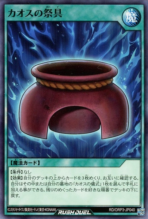 【効果】自分のデッキの上からカードを3枚めくり、お互いに確認する。自分はその中または自分の墓地の「カオスの儀式」1枚を選んで手札に加える事ができる。残りのめくったカードを好きな順番でデッキの下に戻す。