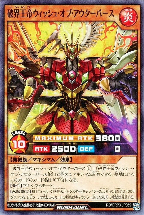 【永続効果】相手フィールドの表側表示モンスター(ギャラクシー族以外)の攻撃力は3000ダウンする。自分ターンの間、このカードの種族はギャラクシー族になり、その攻撃は貫通する。