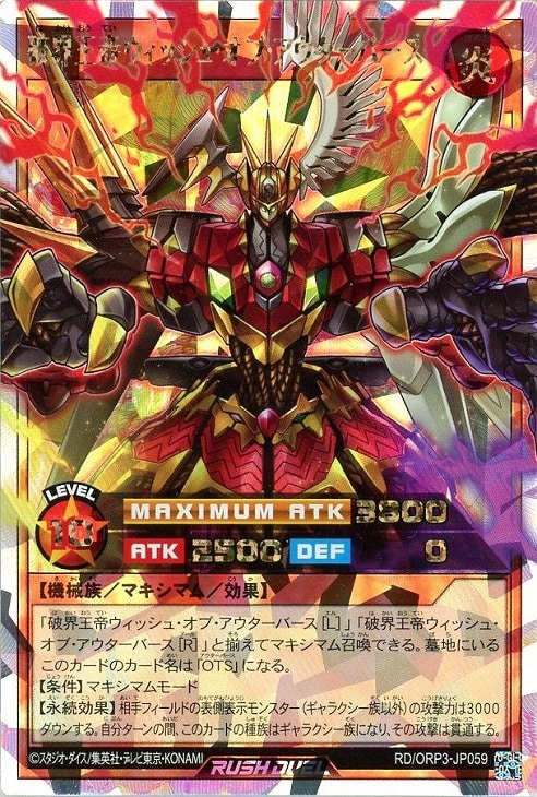 「破界王帝ウィッシュ・オブ・アウターバース[L]」「破界王帝ウィッシュ・オブ・アウターバース[R]」と揃えてマキシマム召喚できる。墓地にいるこのカードのカード名は「OTS」になる。