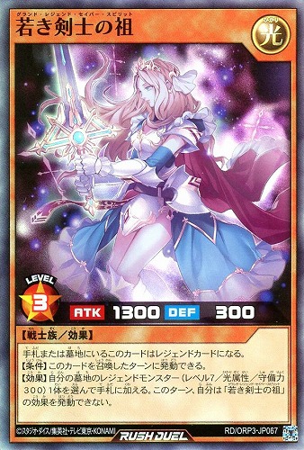 【効果】自分の墓地のレジェンドモンスター(レベル7/光属性/守備力300)1体を選んで手札に加える。このターン、自分は「若き剣士の祖」の効果を発動できない。
