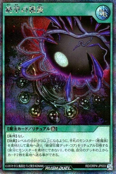 【効果】レベルの合計が3以上になるように、手札のモンスター(悪魔族)を素材として墓地へ送り、「絶望狂魔デッド・コア」をリチュアル召喚する(余分にモンスターを素材にできない)。その後、自分のデッキの上からカード2枚を墓地へ送る事ができる。