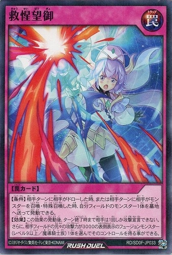 【効果】この効果の発動後、ターン終了時まで相手は1回しか攻撃宣言できない。さらに、相手フィールドの元々の攻撃力が3000の表側表示のフュージョンモンスター(レベル9以上/魔導騎士族)1体を選んでそのコントロールを得る事ができる。