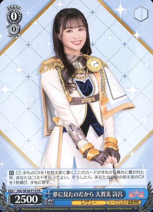 - 【自】[(1) 手札のCXを1枚控え室に置く] このカードが手札から舞台に置かれた時、あなたはコストを払ってよい。そうしたら、あなたは自分の控え室のCXを1枚選び、手札に戻す。
