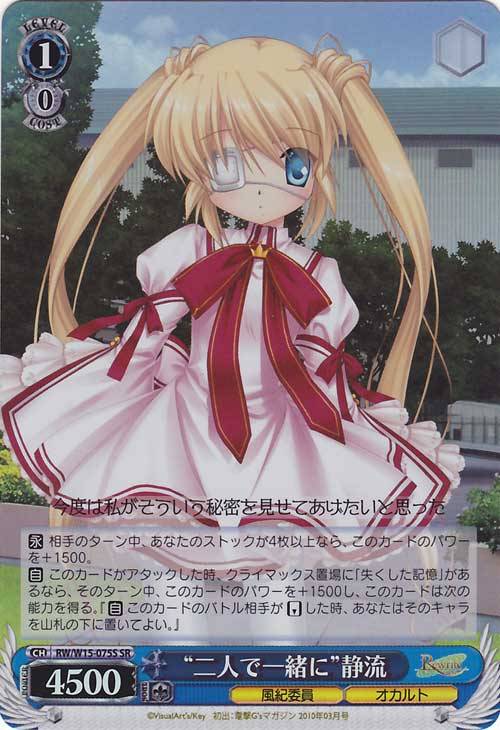 - 【永】 相手のターン中、あなたのストックが4枚以上なら、このカードのパワーを+1500。【自】 このカードがアタックした時、クライマックス置場に「失くした記憶」があるなら、そのターン中、このカードのパワーを+1500し、このカードは次の能力を得る。『【自】 このカードのバトル相手が【リバース】した時、あなたはそのキャラを山札の下に置いてよい。』フレーバー:今度は私がそういう秘密を見せてあげたいと思った