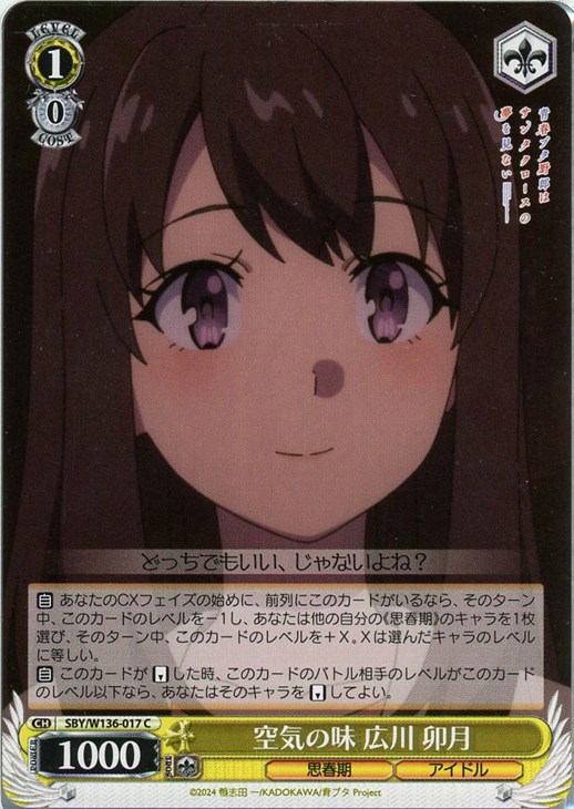 【自】 あなたのCXフェイズの始めに、前列にこのカードがいるなら、そのターン中、このカードのレベルを-1し、あなたは他の自分の《思春期》のキャラを1枚選び、そのターン中、このカードのレベルを+X。Xは選んだキャラのレベルに等しい。