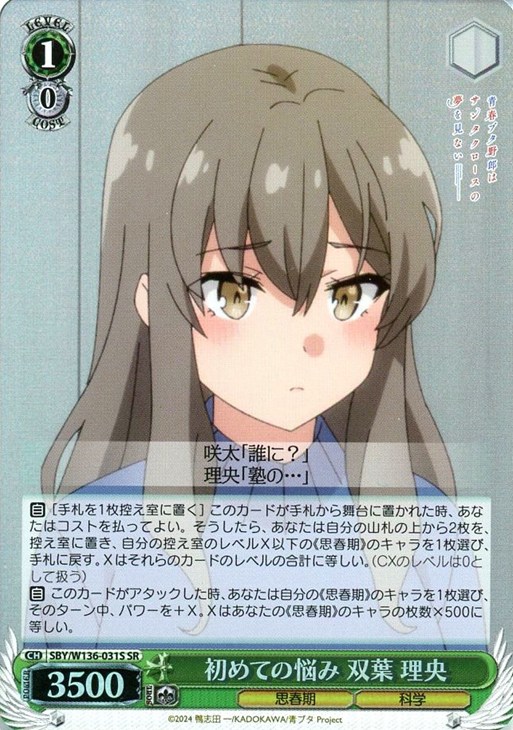 【自】 このカードがアタックした時、あなたは自分の《思春期》のキャラを1枚選び、そのターン中、パワーを+X。Xはあなたの《思春期》のキャラの枚数×500に等しい。