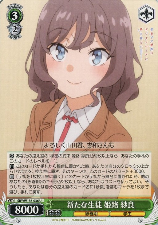 【永】 あなたの控え室の「秘密の約束 姫路 紗良」が2枚以上なら、あなたの手札のこのカードのレベルを-1。