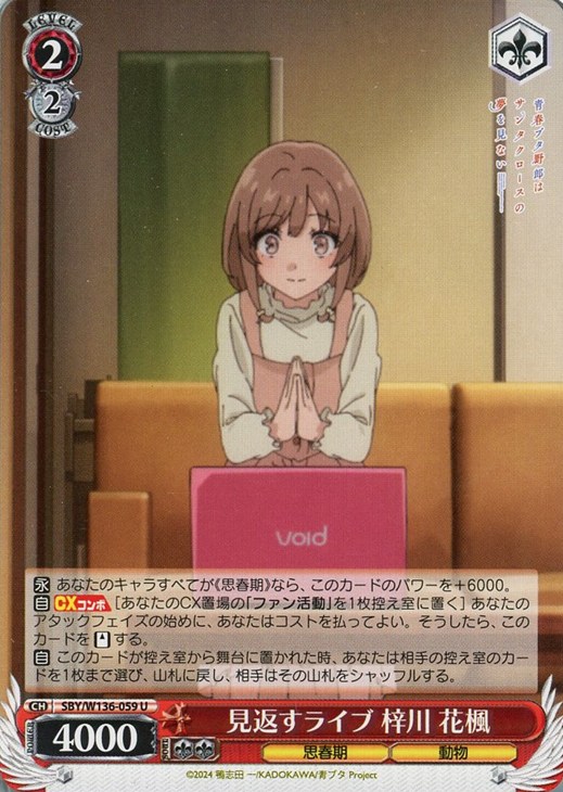 【自】【CXコンボ】[あなたのCX置場の「ファン活動」を1枚控え室に置く] あなたのアタックフェイズの始めに、あなたはコストを払ってよい。そうしたら、このカードを【スタンド】する。