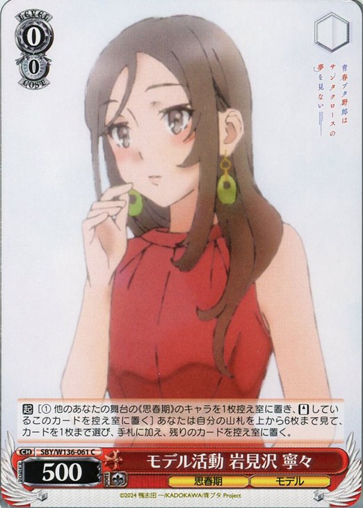 - 【起】[(1) 他のあなたの舞台の《思春期》のキャラを1枚控え室に置き、【スタンド】しているこのカードを控え室に置く] あなたは自分の山札を上から6枚まで見て、カードを1枚まで選び、手札に加え、残りのカードを控え室に置く。