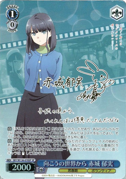 【自】 [(2)] あなたのレベルが3以上なら、あなたのアタックフェイズの始めに、あなたはコストを払ってよい。そうしたら、あなたは自分のレベル置場の「今日という日 赤城 郁実」を1枚とこのカードを選び、入れ替える。(舞台に置くキャラは【スタンド】して置かれる)