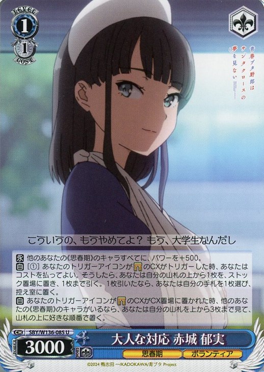 【自】 あなたのトリガーアイコンがゲートのCXがCX置場に置かれた時、他のあなたの《思春期》のキャラがいるなら、あなたは自分の山札を上から3枚まで見て、山札の上に好きな順番で置く。