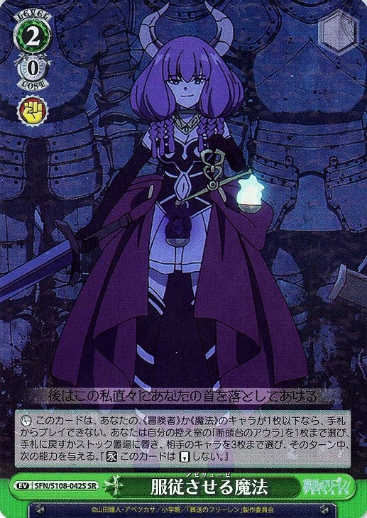 - 【カウンター】 このカードは、あなたの、《冒険者》か《魔法》のキャラが1枚以下なら、手札からプレイできない。あなたは自分の控え室の「断頭台のアウラ」を1枚まで選び、手札に戻すかストック置場に置き、相手のキャラを3枚まで選び、そのターン中、次の能力を与える。『【永】 このカードは【リバース】しない。』