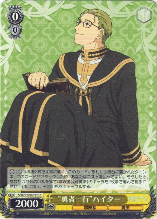 【自】[(1) 手札を2枚控え室に置く] このカードが手札から舞台に置かれたターン中、このカードがアタックした時、あなたはコストを払ってよい。そうしたら、あなたは自分の山札を見て《冒険者》か《魔法》のキャラを2枚まで選んで相手に見せ、手札に加え、その山札をシャッフルする。