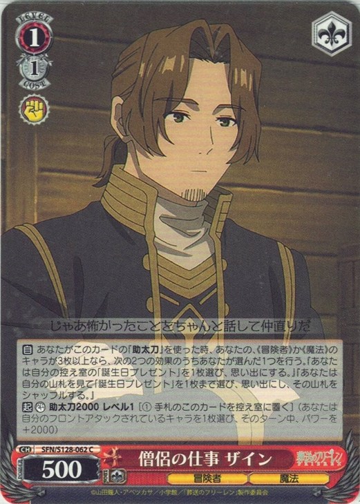 【自】 あなたがこのカードの『助太刀』を使った時、あなたの、《冒険者》か《魔法》のキャラが3枚以上なら、次の2つの効果のうちあなたが選んだ1つを行う。『あなたは自分の控え室の「誕生日プレゼント」を1枚選び、思い出にする。』『あなたは自分の山札を見て「誕生日プレゼント」を1枚まで選び、思い出にし、その山札をシャッフルする。』