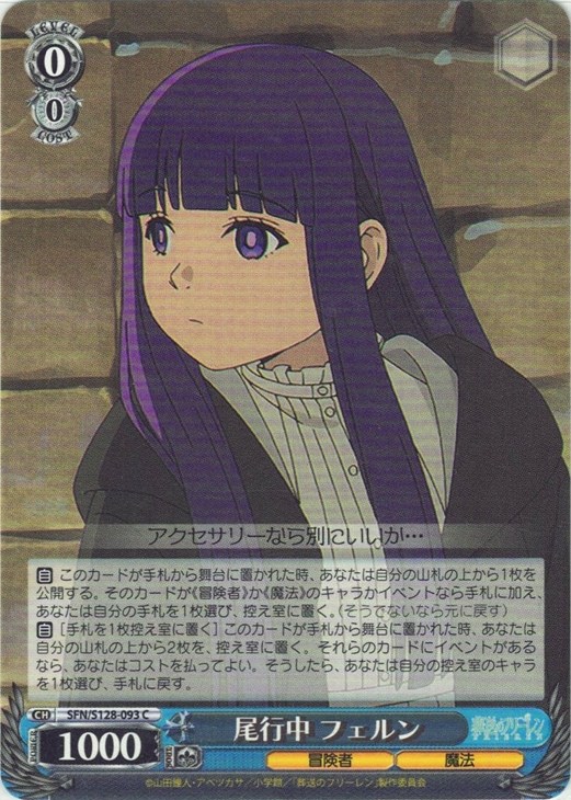 【自】 このカードが手札から舞台に置かれた時、あなたは自分の山札の上から1枚を公開する。そのカードが《冒険者》か《魔法》のキャラかイベントなら手札に加え、あなたは自分の手札を1枚選び、控え室に置く。(そうでないなら元に戻す)