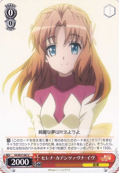 - 【自】[このカードを控え室に置く] 他のあなたのカード名に「マリア」を含むキャラがフロントアタックされた時、あなたはコストを払ってよい。そうしたら、あなたは自分のバトル中のキャラを1枚選び、そのターン中、パワーを+1500。フレーバー:綺麗な夢は叶えようよ