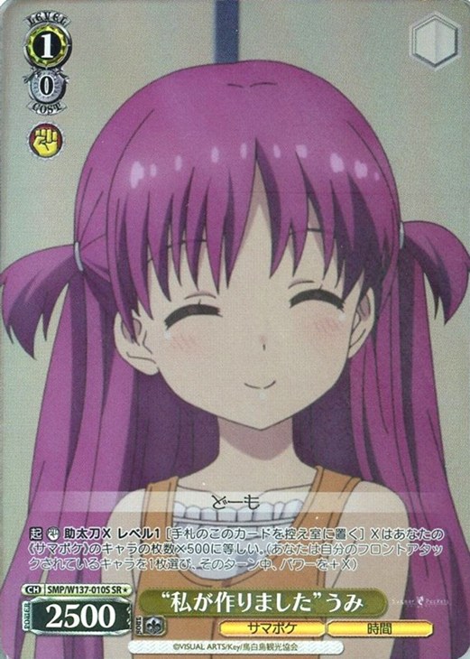 - 【起】【カウンター】 助太刀X レベル1 [手札のこのカードを控え室に置く] Xはあなたの《サマポケ》のキャラの枚数×500に等しい。(あなたは自分のフロントアタックされているキャラを1枚選び、そのターン中、パワーを+X)