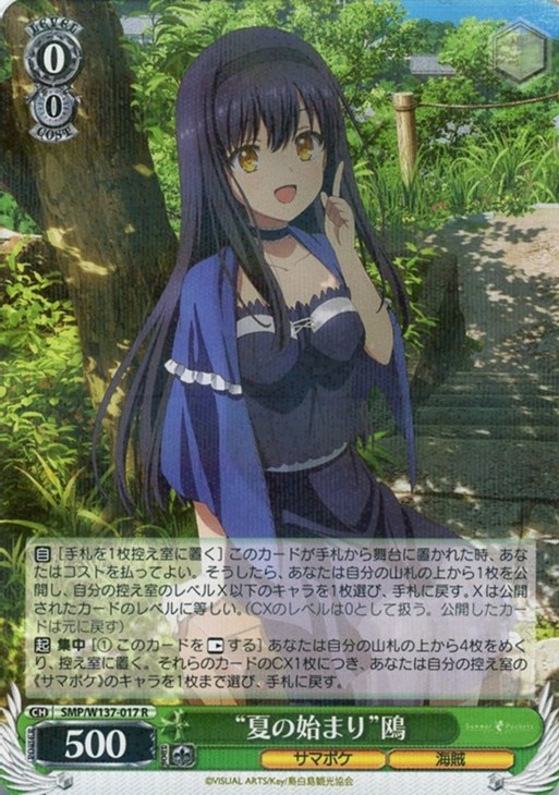 【起】 集中 [(1) このカードを【レスト】する] あなたは自分の山札の上から4枚をめくり、控え室に置く。それらのカードのCX1枚につき、あなたは自分の控え室の《サマポケ》のキャラを1枚まで選び、手札に戻す。