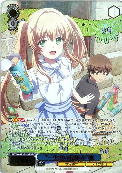 【自】【CXコンボ】 あなたのCX置場に「おかえりなさい」が置かれた時、他のあなたの《サマポケ》のキャラが2枚以上なら、あなたは自分のキャラを1枚選び、そのターン中、次の能力を与える。『【自】 このカードのバトル相手が【リバース】した時、あなたは自分の山札を見て《サマポケ》のキャラを1枚まで選んで相手に見せ、手札に加え、その山札をシャッフルする。』