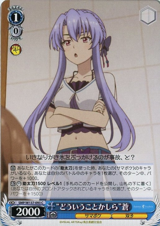 【自】 あなたがこのカードの『助太刀』を使った時、あなたの《サマポケ》のキャラがいるなら、あなたは自分のバトル中のキャラを1枚選び、そのターン中、パワーを+1000。